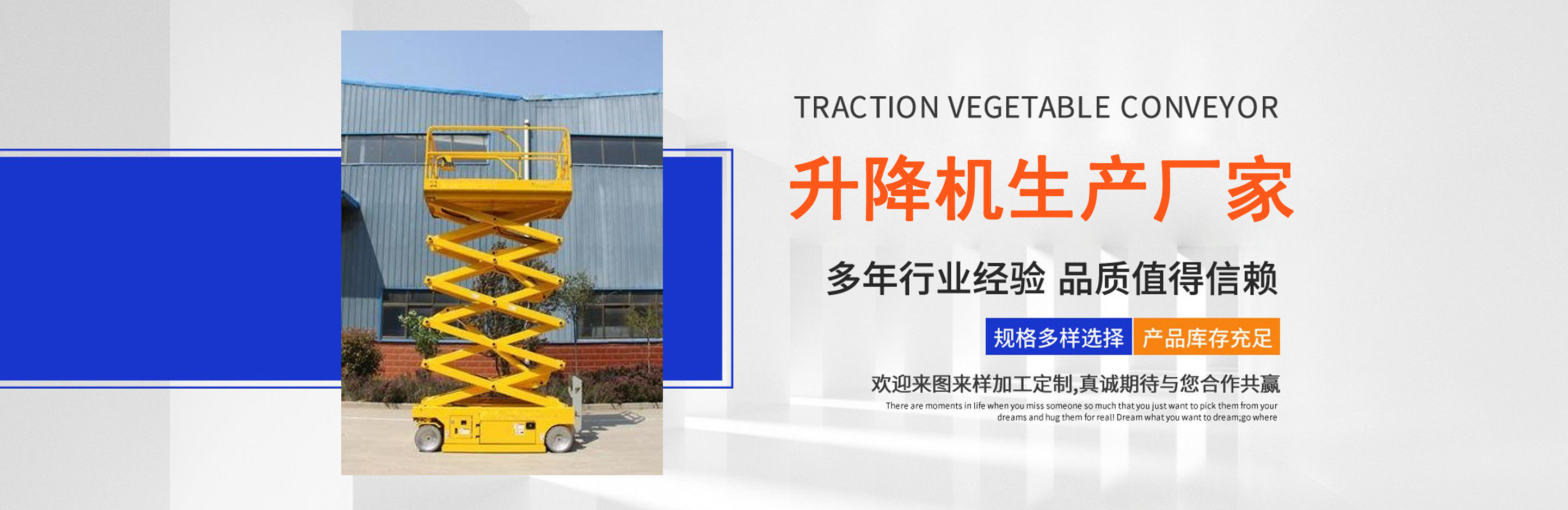 升降機(jī)生產(chǎn)廠家是專業(yè)從事升降平臺(tái),液壓貨梯,卸豬臺(tái),平板拖車(chē),液壓提升機(jī),移動(dòng)式升降機(jī),升降平臺(tái)車(chē),高空作業(yè)設(shè)備,貨梯廠家,液壓登車(chē)橋等升降機(jī)械產(chǎn)品制造十余年,服務(wù)過(guò)各大國(guó)內(nèi)外企業(yè)?! ∽怨緞?chuàng)立以來(lái),經(jīng)過(guò)長(zhǎng)期對(duì)液壓升降臺(tái)的研制和探索,積累了豐富的專業(yè)制造技術(shù)和寶貴經(jīng)驗(yàn)。憑借豐富的專業(yè)技術(shù)及不斷開(kāi)拓創(chuàng)新的精神,現(xiàn)已成為專業(yè)于升降機(jī)械的公司?! ¢L(zhǎng)期以來(lái),憑借公司不斷的壯大及對(duì)液壓技術(shù)的不斷改進(jìn)和探索。能根據(jù)客戶不同的要求設(shè)計(jì)一套合理、完善的方案供客戶參考?,F(xiàn)有產(chǎn)品:升降平臺(tái),液壓貨梯,卸豬臺(tái),平板拖車(chē),液壓提升機(jī),移動(dòng)式升降機(jī),升降平臺(tái)車(chē),高空作業(yè)設(shè)備,貨梯廠家,液壓登車(chē)橋等。本產(chǎn)品在各類工礦企業(yè)、港口物流以及其它領(lǐng)域均發(fā)揮著重要的作用。始終以“以信譽(yù)求生存、以技術(shù)求發(fā)展”為本廠的經(jīng)營(yíng)理念。只要你選購(gòu)我廠的產(chǎn)品,無(wú)論你身在何方都能得到我們迅捷優(yōu)良的服務(wù)?! 」咀猿闪⒁呀?jīng)來(lái)本著"團(tuán)結(jié)、求實(shí)、創(chuàng)新、互贏"的理念,以先進(jìn)的技術(shù)和服務(wù),為客戶建造滿意的產(chǎn)品。幾年來(lái)受到廣大客戶的好評(píng)。...